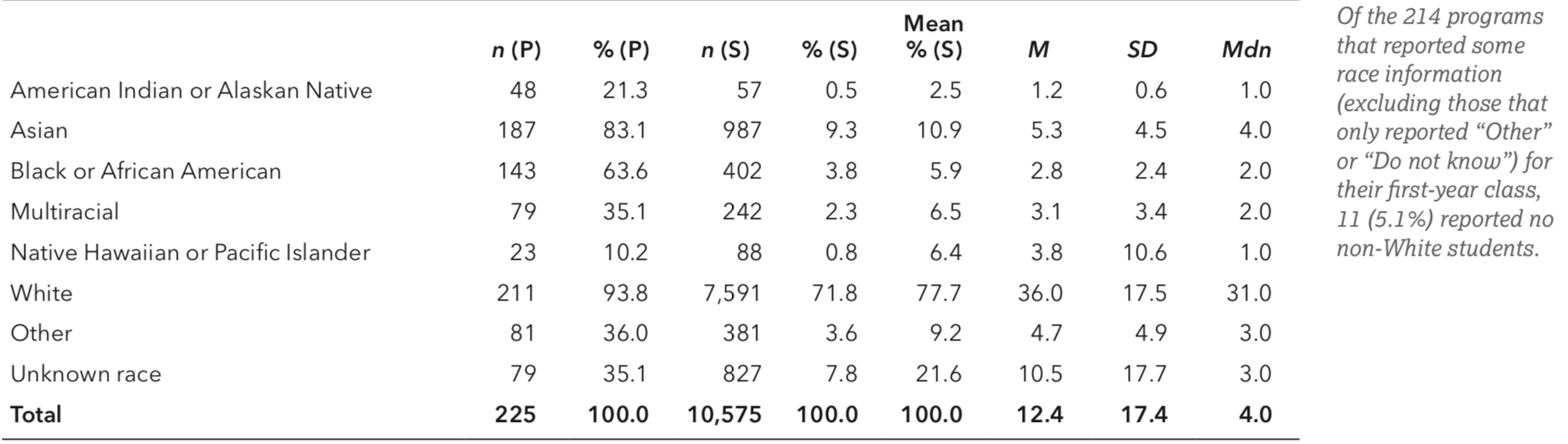 Some encouraging news regarding current PA students is that the first-year PA students from this previous year were more diverse than the current makeup of practicing PAs. We can hope that this trend continues to broaden the amount of diversity we see each year. Unfortunately, as the table points out from last year, there were more than 10 programs (over 5%) that noted that they had ZERO non-white students. See the table below from PAEA’s Annual Program Report: